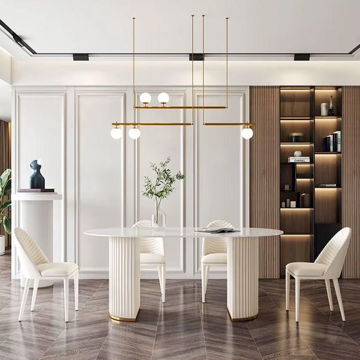 Verfraai uw eetruimte met deze moderne eettafel met sierlijke rondingen voor een luxueuze en verfijnde touch. Gecombineerd met onze fantastische Darling eetkamerstoelen, kunt u kiezen uit een model voor 4 tot 6 personen. Deze prachtige set, versierd met een marmeren tafelblad ondersteund door twee pilaren, tilt elke eetkamer naar een eerbiedwaardig en verfijnd toevluchtsoord.