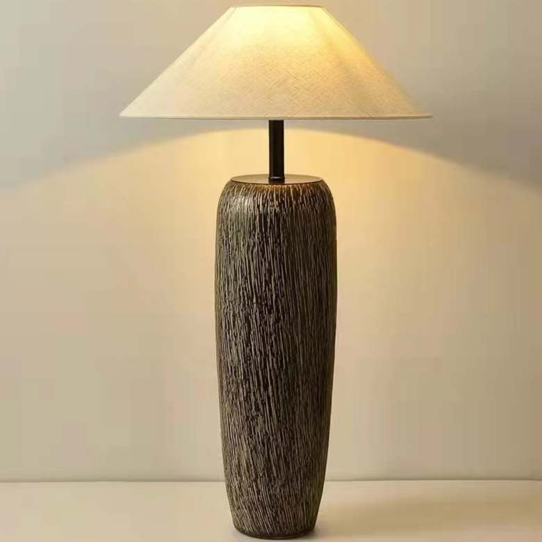 De houten textuur en unieke grote lampenkap geven elke kamer een gevoel van grandeur. Het grote formaat maakt het een echte blikvanger en een ideale staande lamp, terwijl het contrast tussen de materialen een unieke, warme en uitnodigende sfeer creëert.